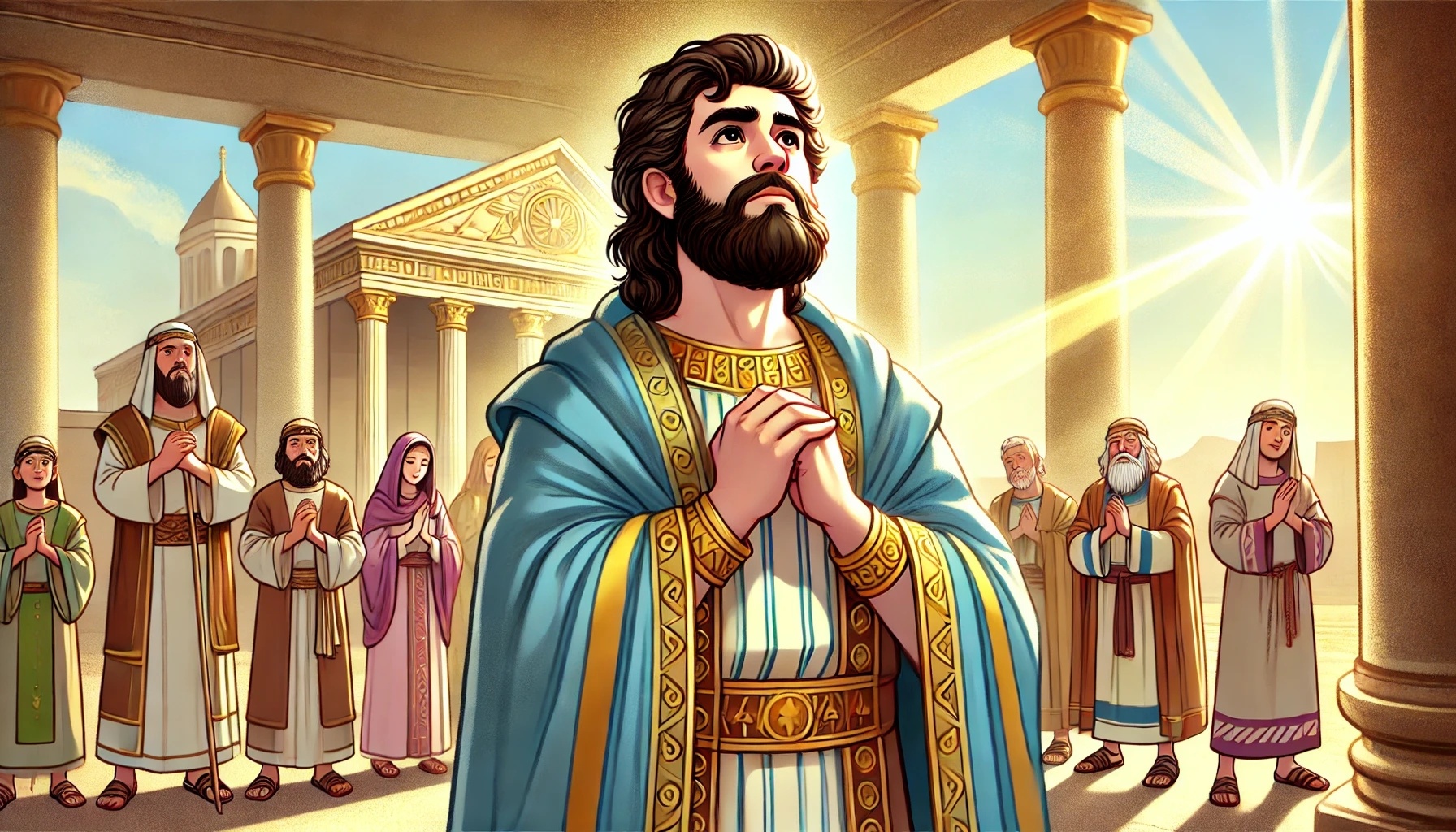 Ma ora accade qualcosa di altrettanto importante. Salomone si presenta davanti al popolo e inizia a pregare. Non parla in silenzio per sé stesso, ma ad alta voce, così che tutti possano sentirlo. È una preghiera speciale che mostra ciò che davvero ha nel cuore.