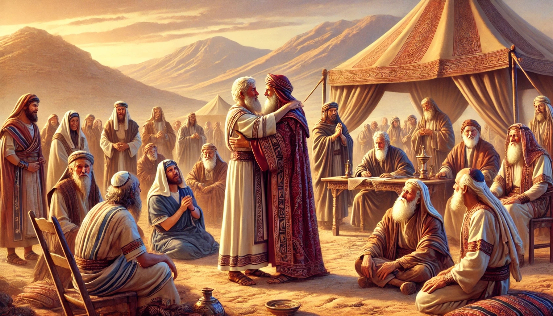 La prima parte descrive la visita di Ietro, il suocero di Mosè – non da solo, ma con sua figlia Sefora (la moglie di Mosè) e i due figli. Questo ritorno familiare è un momento toccante. Dimostra che anche un grande leader come Mosè non era isolato – la famiglia era parte della sua vita.