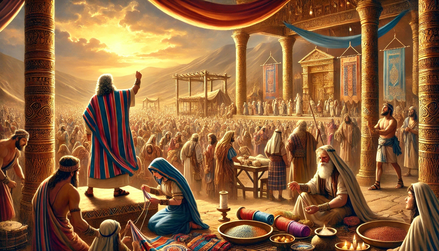 Mosè chiama tutta l’assemblea a portare offerte volontarie per la costruzione del Tabernacolo — doni dal cuore, non imposti. Oro, argento, pietre preziose, tessuti, legno, olio — tutto è necessario. Colpisce la varietà dei contributi: i ricchi offrono metalli preziosi; le donne filano la lana; i capi portano le pietre. Ognuno contribuisce secondo le proprie possibilità.